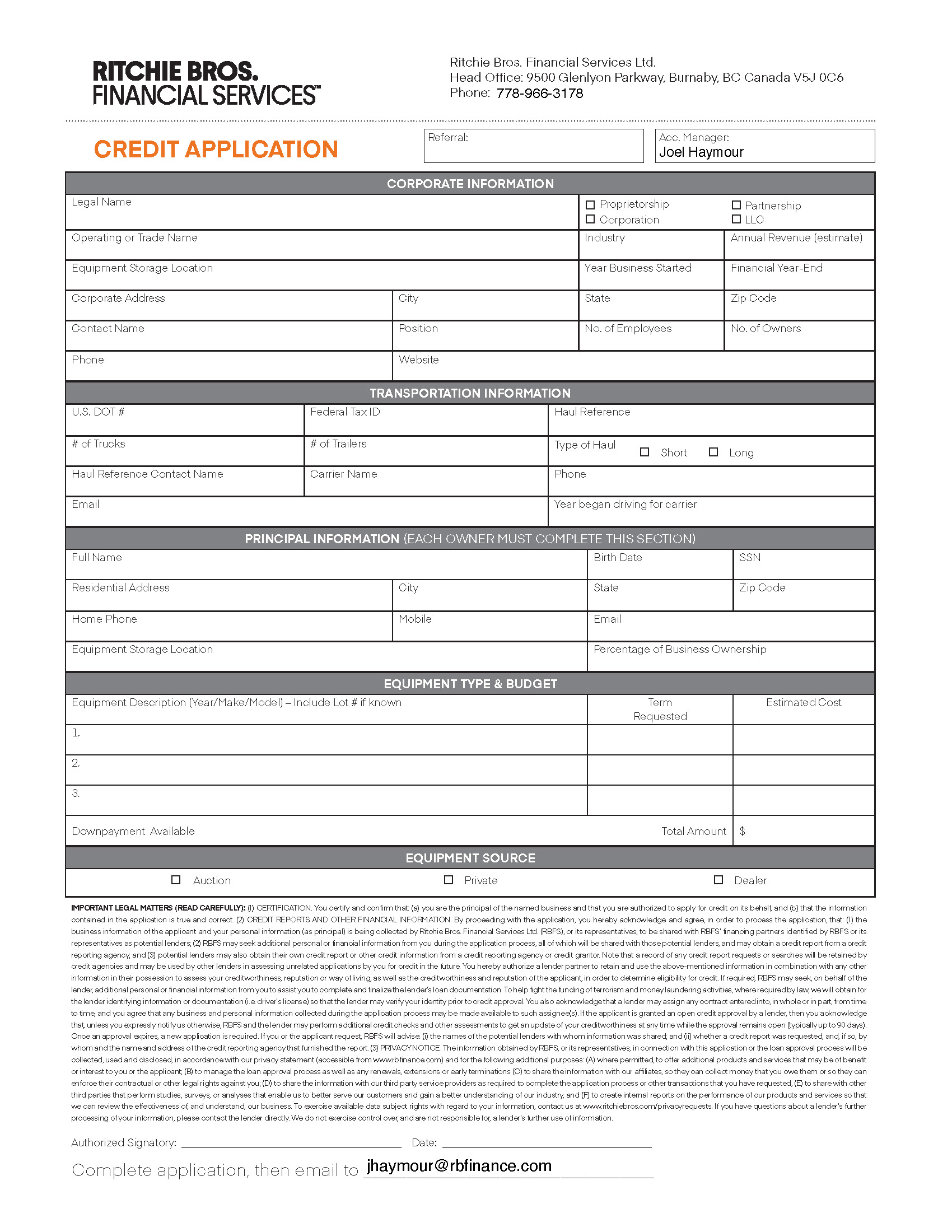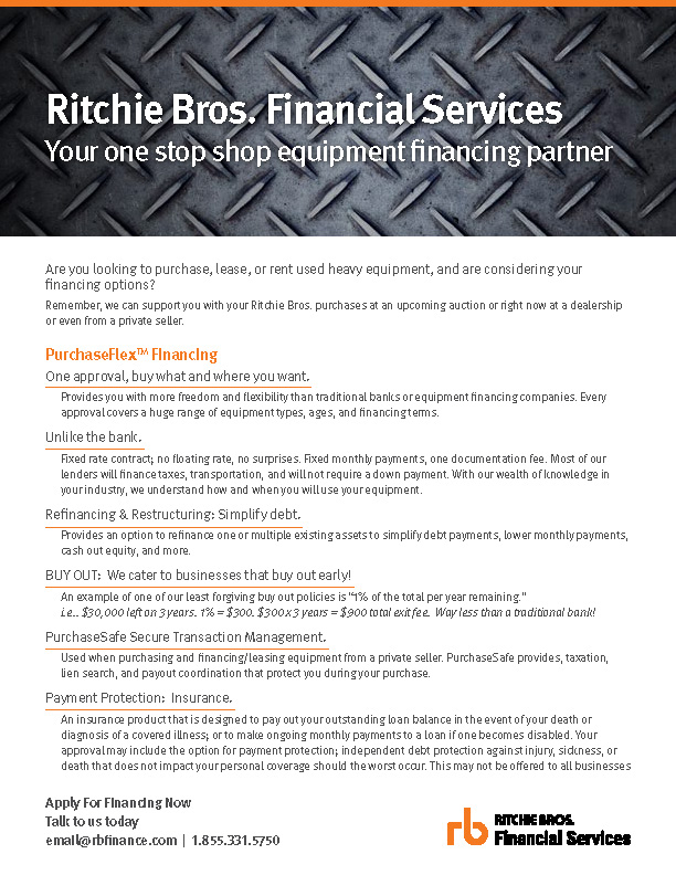 our partnership with Ritchie Bros Financial Services to provide you with streamlined financing option for your equipment purchases.